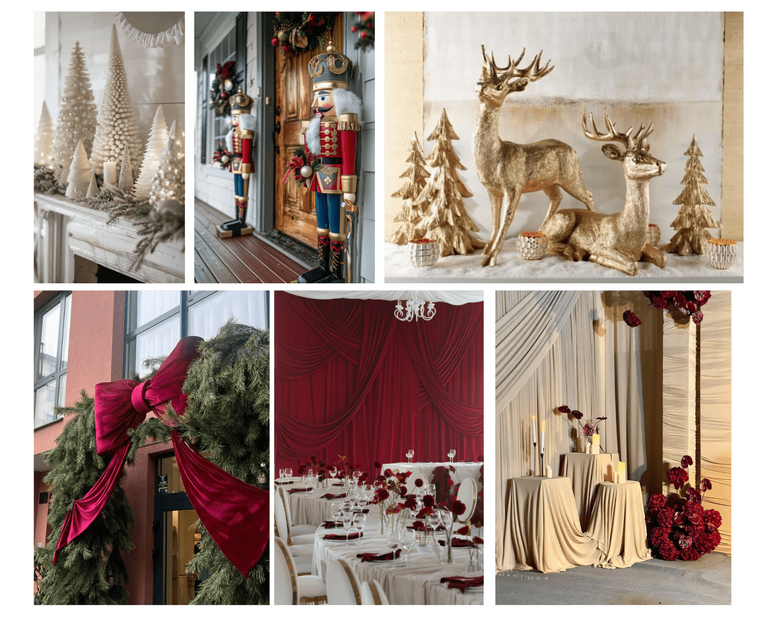 • Design Execution: Think oversized, minimalist textured Christmas trees instead of small green plastic ones. Humanized Santa Claus or nutcrackers. Traditional red is used as a bold accent color against a neutral backdrop, rather than the main event. Large ribbons as main accents in your main door.